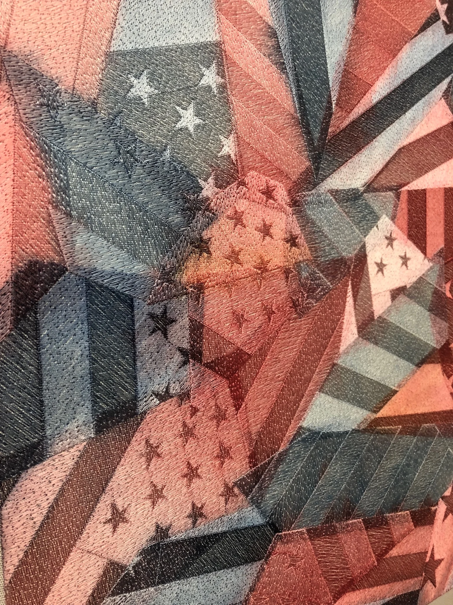 I’ve recently introduced elements of hand-painting and collage into my unique language of digital embroidery. Energized by a new world of possibilities, I have kicked-off 2019 by injecting these techniques into my ongoing investigations with flags and geometric topographies. This groundswell of creativity has even opened an entirely new avenue into the creation of tactile crystalline landscapes.